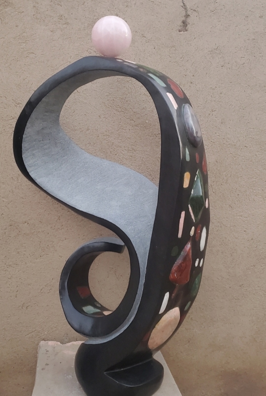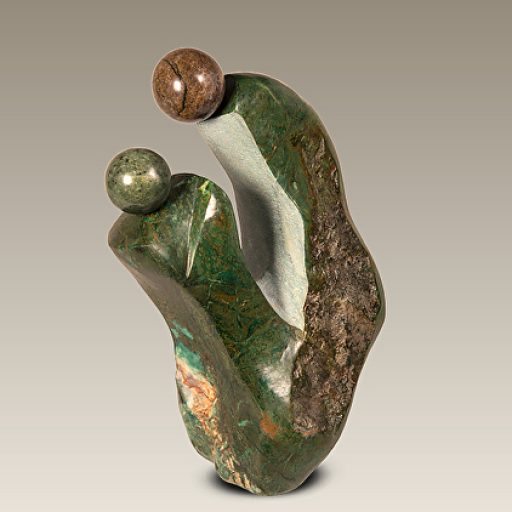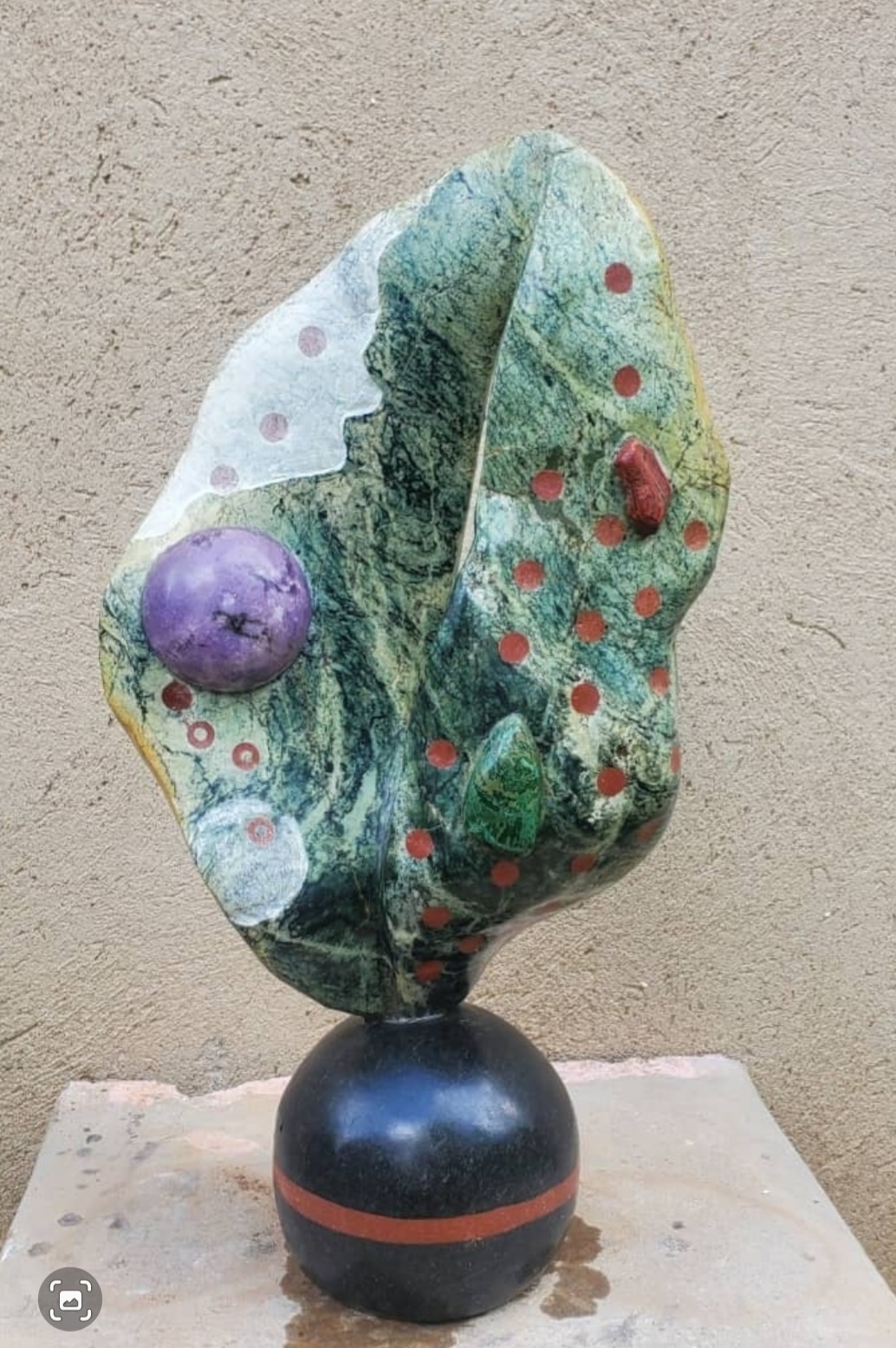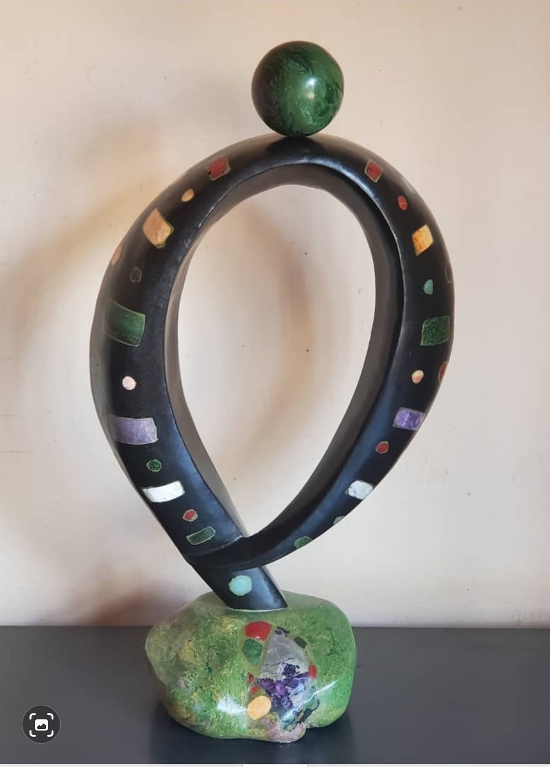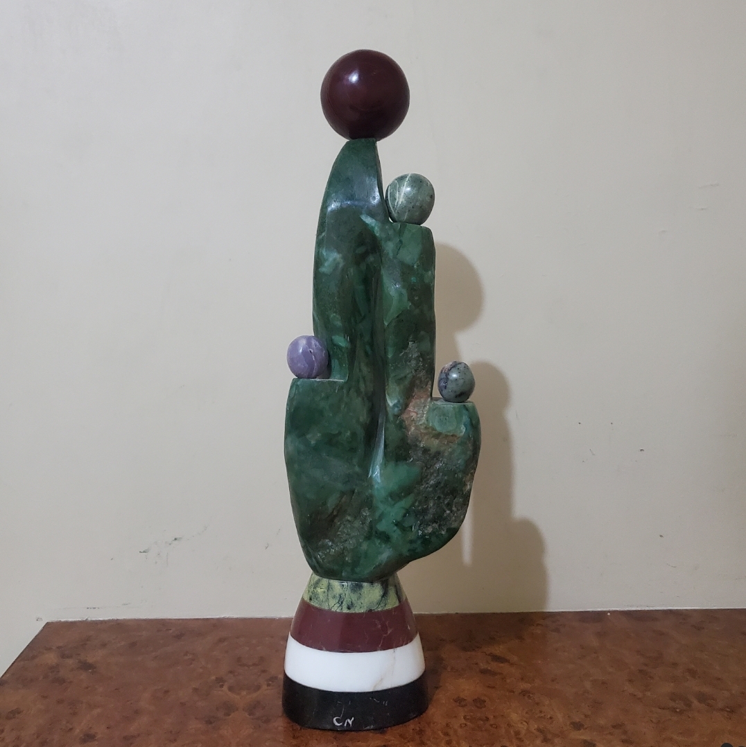 This dynamic looped form, inlaid with colorful stone pieces, embodies vibrancy and movement. The sculpture stands on a green stone base, crowned with a polished green sphere. The interplay of color and form suggests the cycle of life, joy, and the interconnectedness of experiences in Shona philosophy.