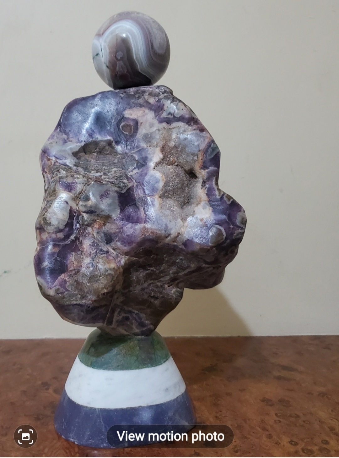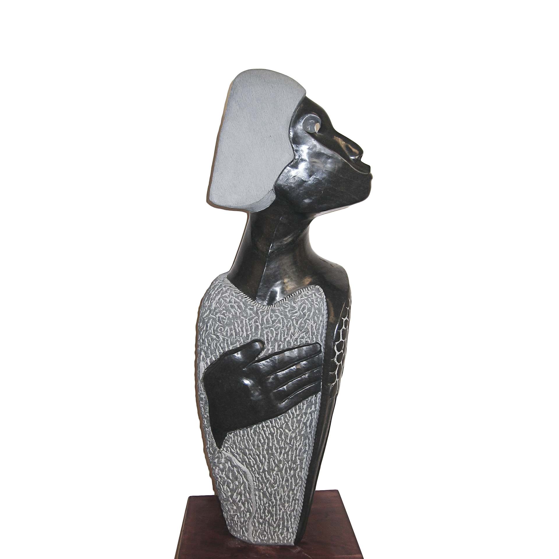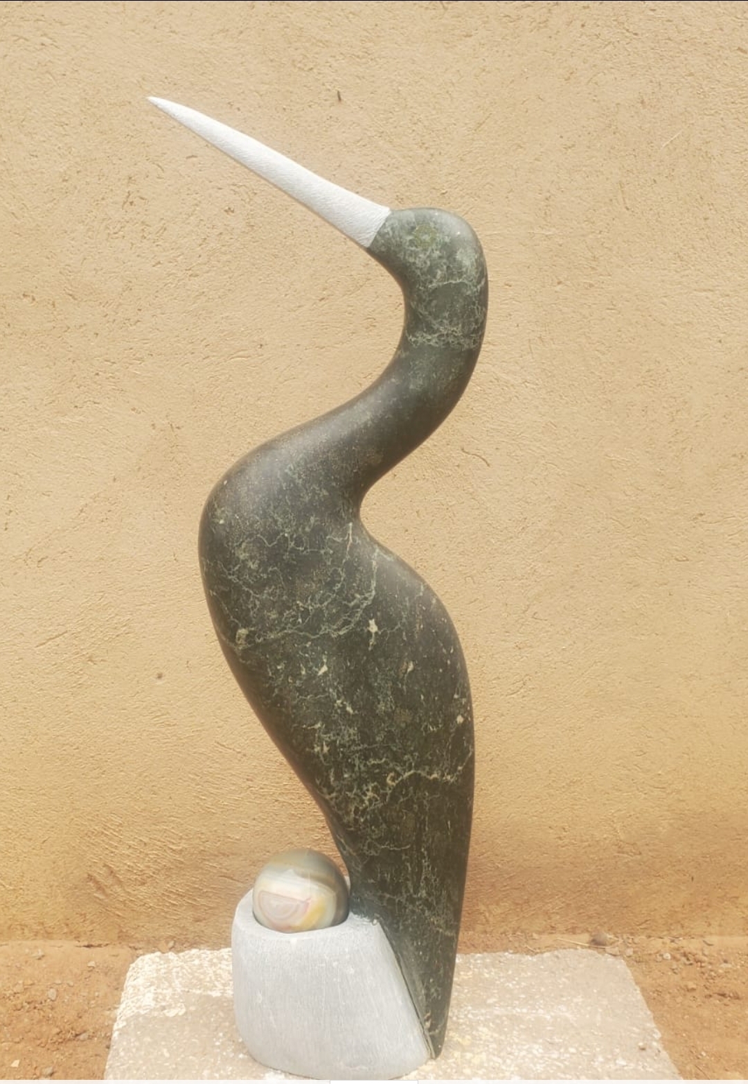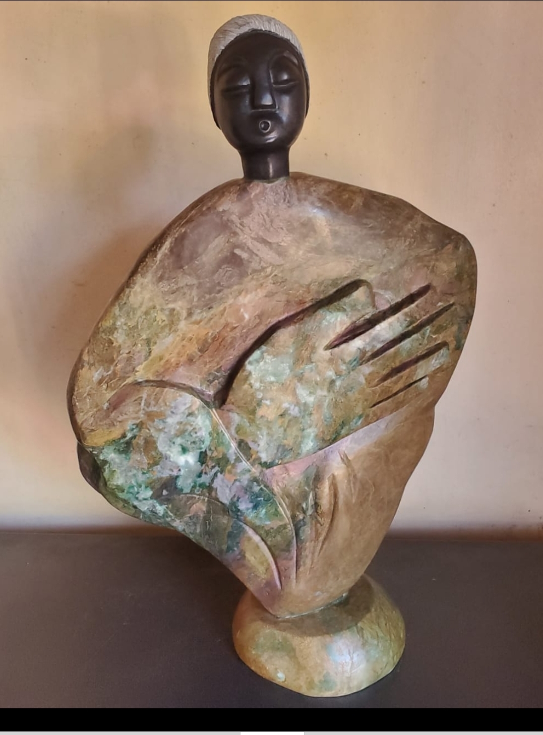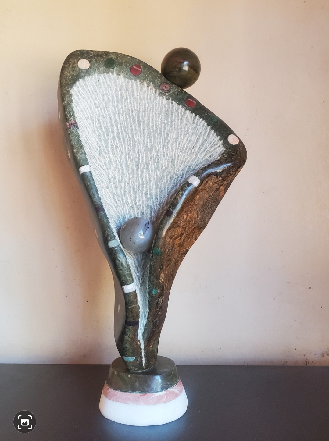 This dynamic looped form, inlaid with colorful stone pieces, embodies vibrancy and movement. The sculpture stands on a green stone base, crowned with a polished green sphere. The interplay of color and form suggests the cycle of life, joy, and the interconnectedness of experiences in Shona philosophy.